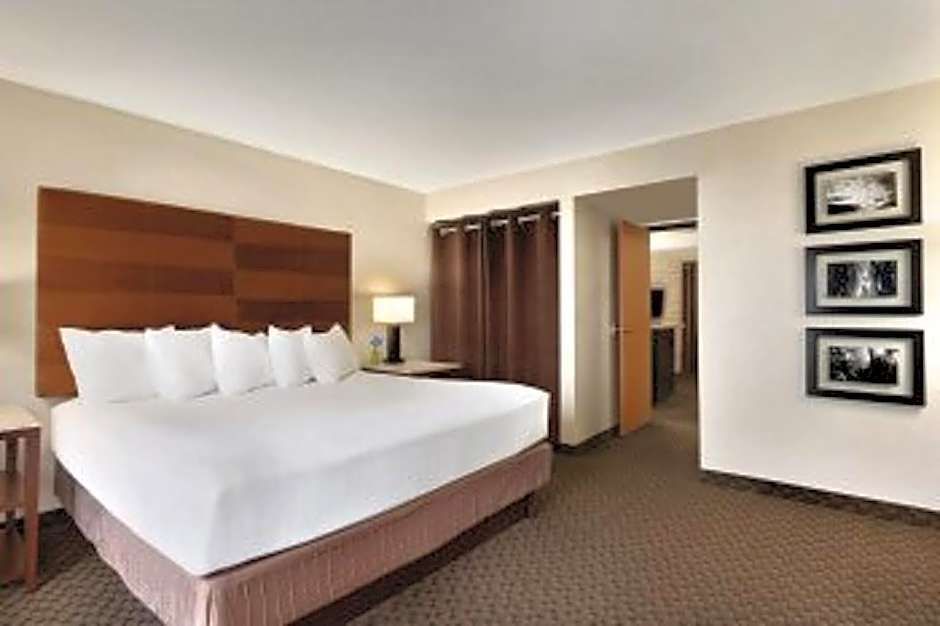 Featuring a large living room with an expansive sofa and a separate sink and vanity in the bedroom, this suite includes a granite-top wet bar, small refrigerator and microwave.